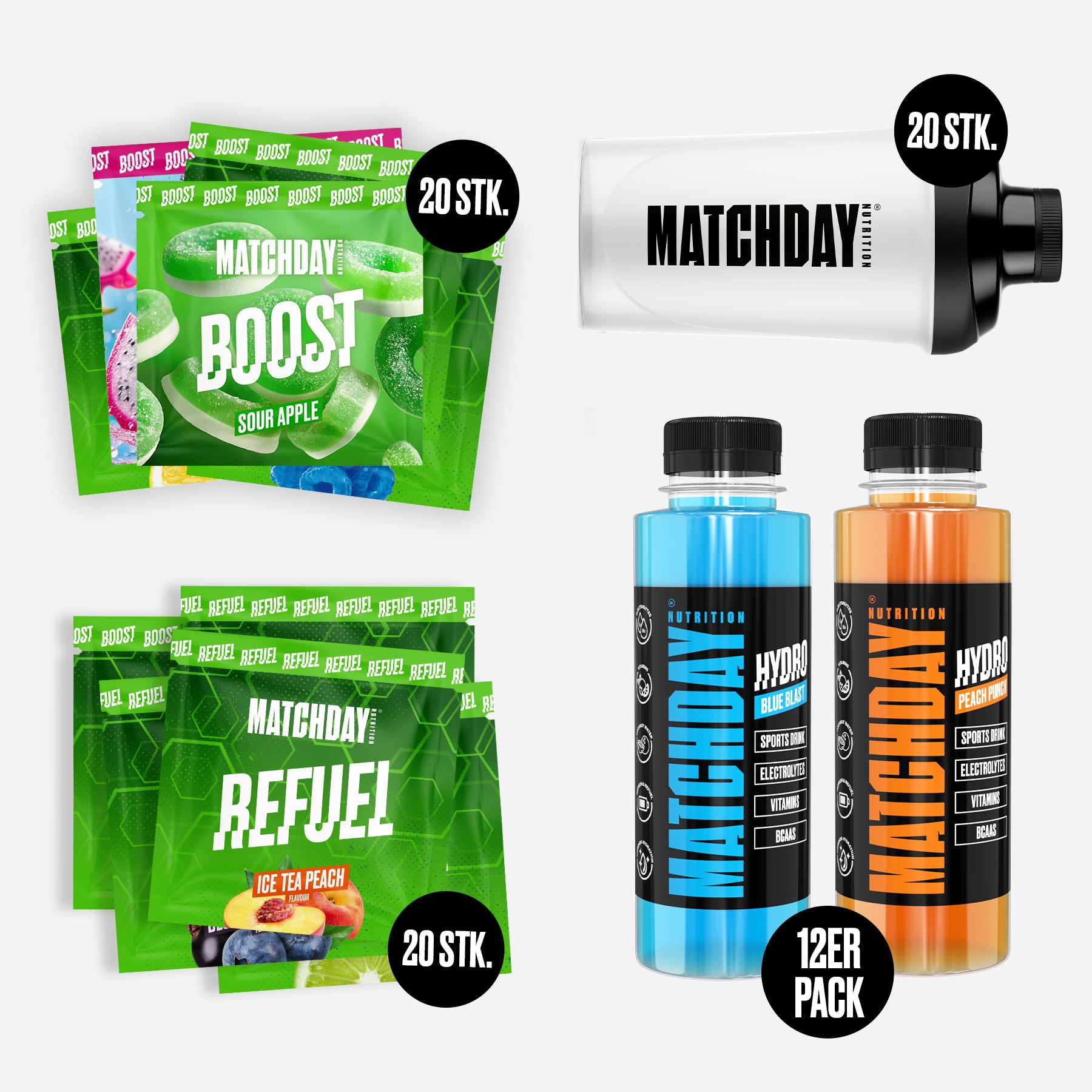 Es sind insgesamt 20x BOOST Sachets (Einmalportionen) enthalten, 20x REFUEL Sachets (EInmalportionen) und 12x 500ml Flaschen von unserem HYDRO Sports Drink. So kann kann jeder Spieler in der Mannschaft die Produkte probieren und ihr könnt eure Favoriten finden!